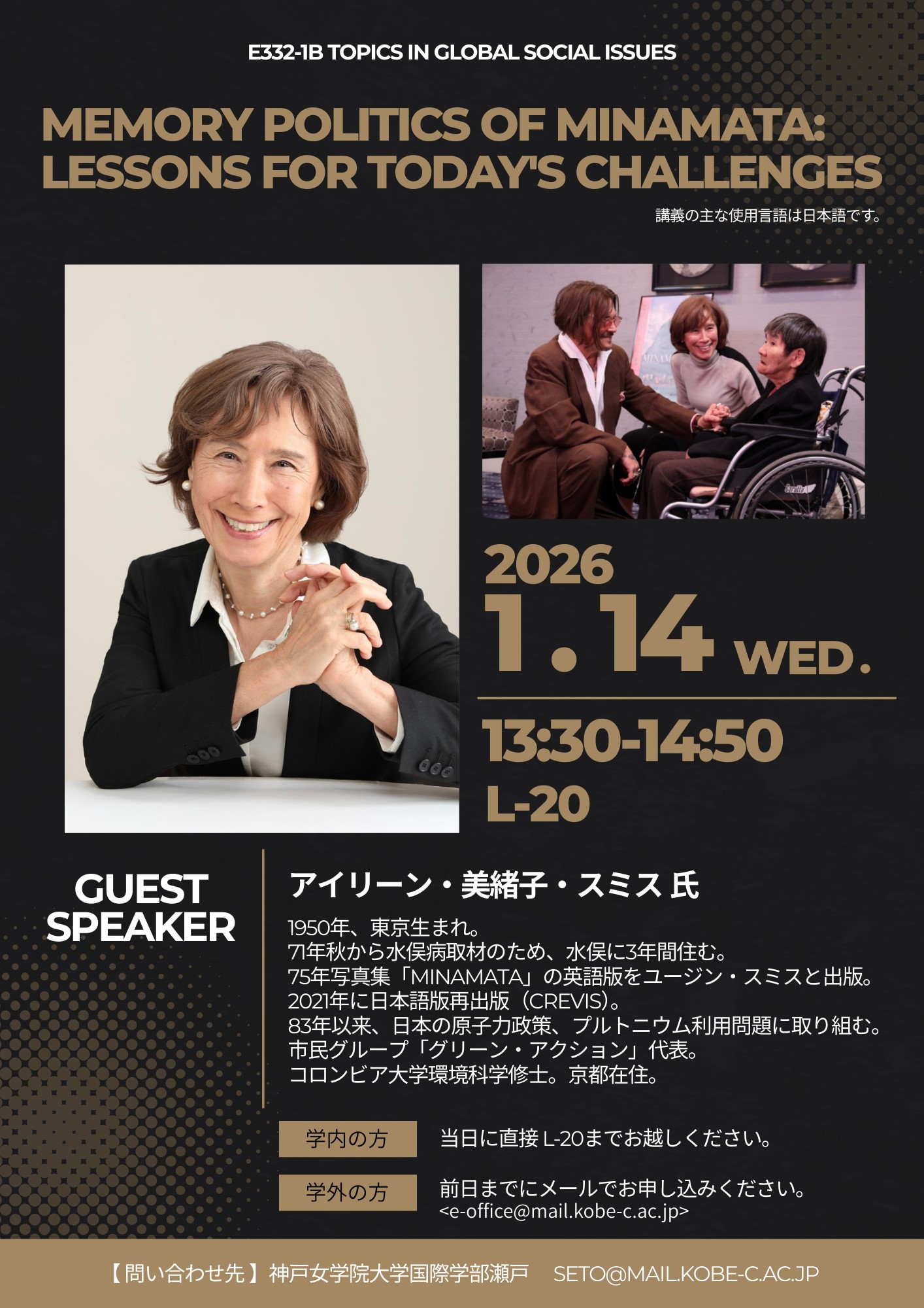 グリーン・アクション代表のアイリーン・美緒子・スミス氏を、国際学部グローバル・スタディーズ学科の瀬戸准教授担当科目E332-1b Topics in Global Social Issuesにお招きし、“Memory Politics of Minamata: Lessons for Today’s Challenges”と題して、特別講義を開催いたします。