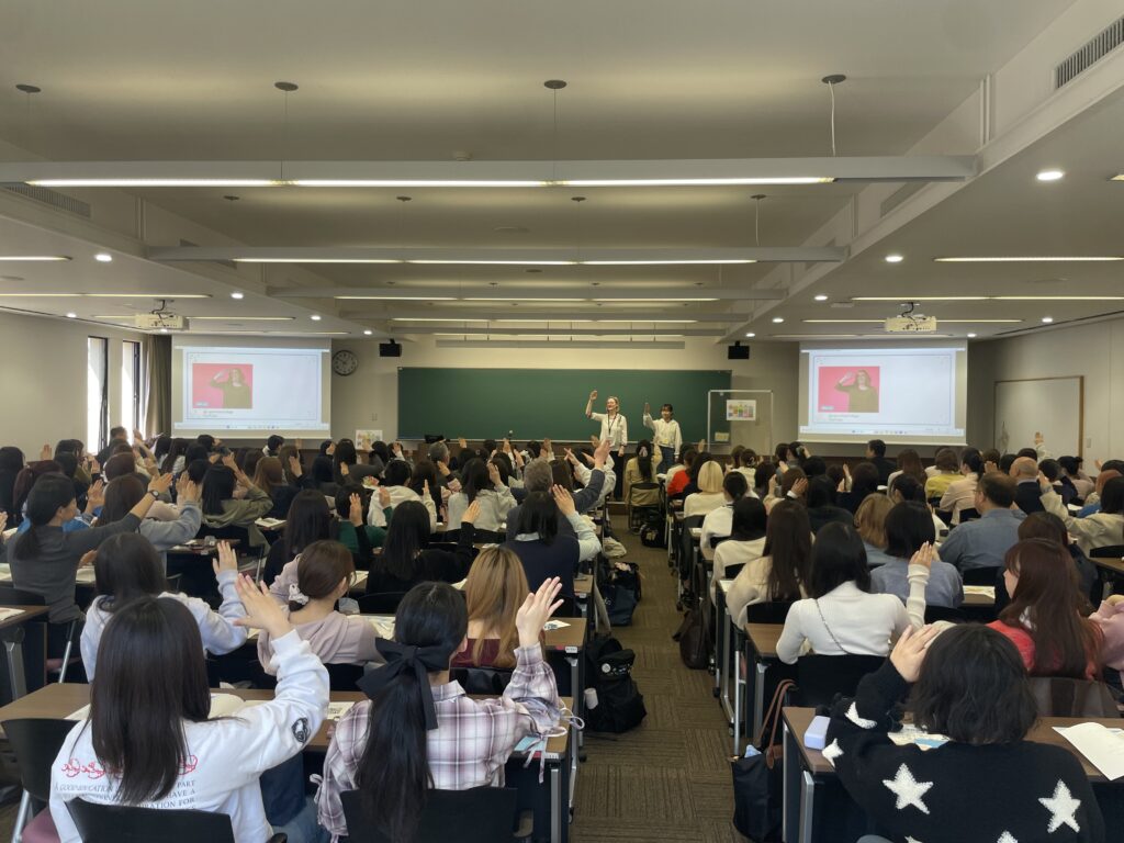 1~2年生の間にそれぞれの学生を担当するアカデミックアドバイザーの先生方ごとにグループになってすわり、最初は手話を使った挨拶でスタート。アメリカ手話と日本手話の「こんにちは」はよく似ていることを知りました。