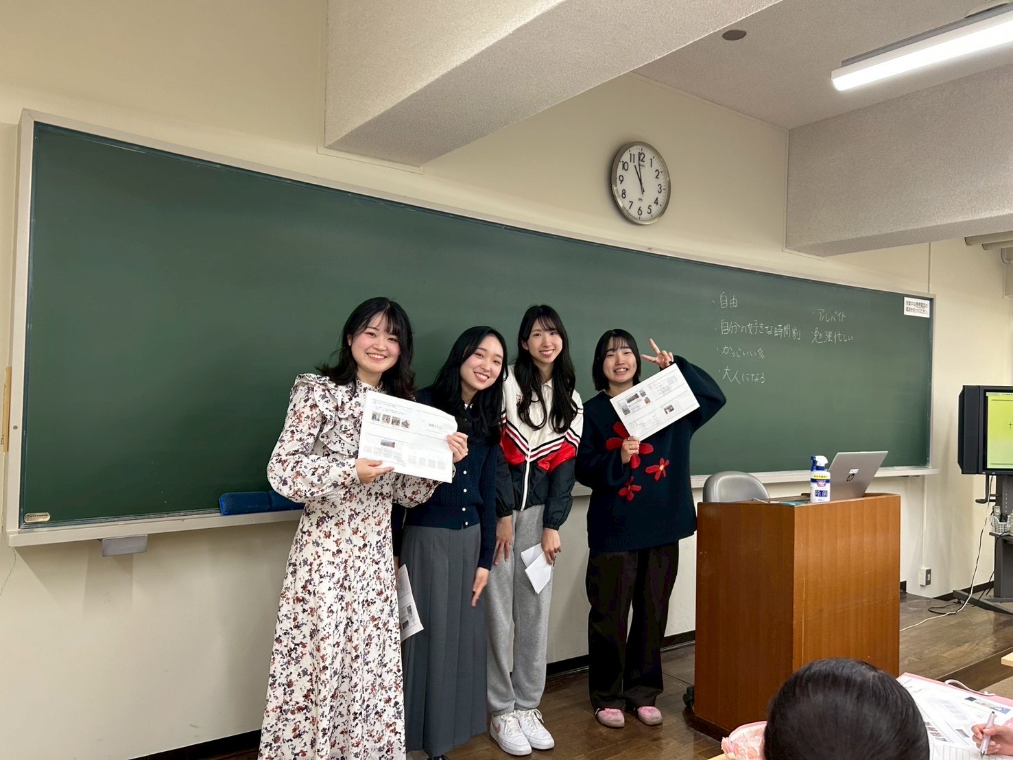白井教授担当の4年生ゼミ生4名(岡さん、小林さん、出口さん、北澤さん)が、「大学って?」というタイトルで、大学がどのような場所なのかイメージしやすいようにプレゼンテーションを行いました。